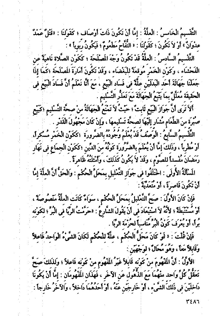 التقسيم الخامس: العلة: إما أن تكون ذات أوصاف؛ كقولنا: "قتل عمد عدوان" أو لا تكون؛ كقولنا: "التفاح مطعوم؛ فيكون ربويا".
