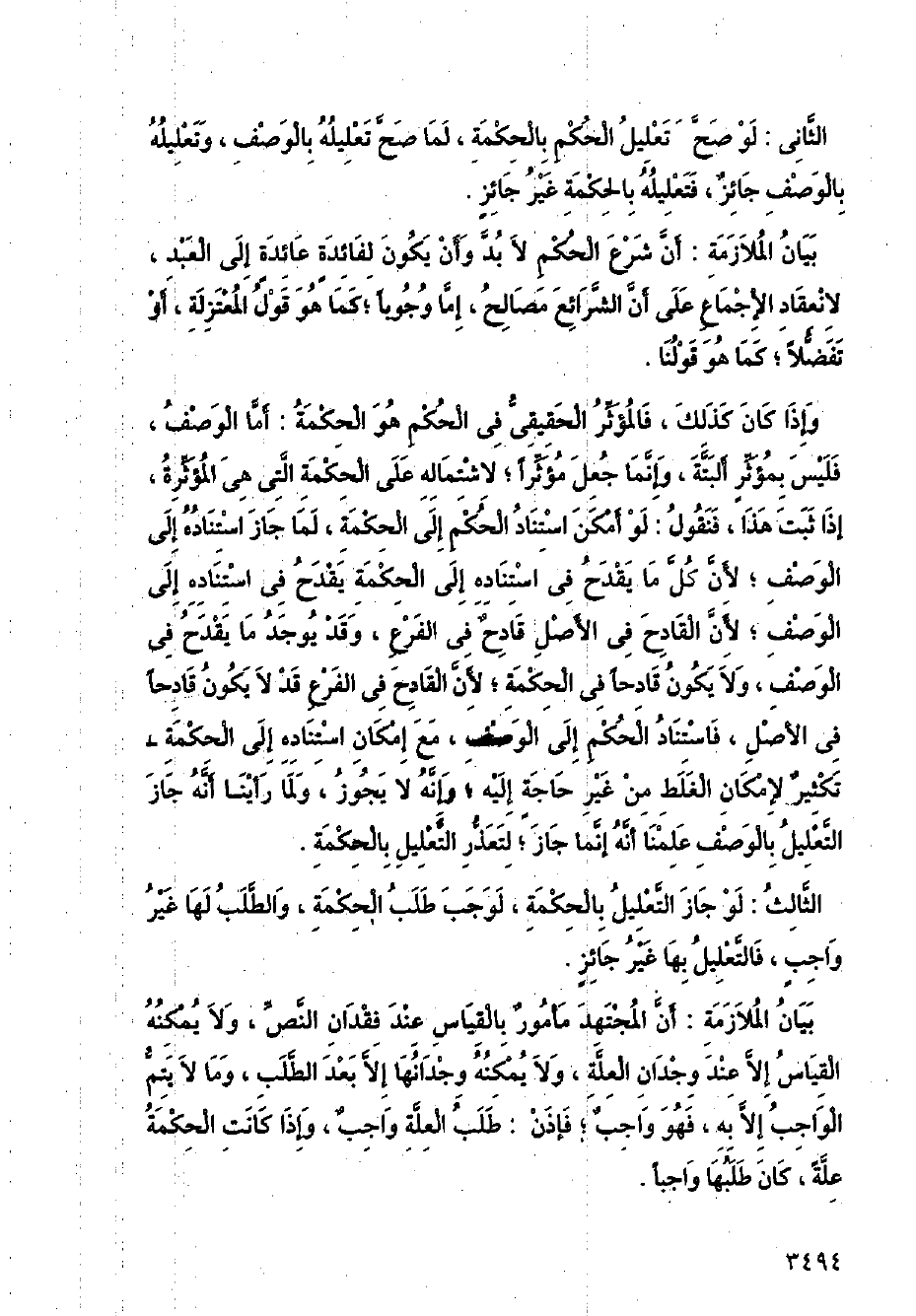 وإذا كان كذلك، فالمؤثر الحقيقي في الحكم هو الحكمة: أما الوصف، فليس بمؤثر ألبتة، وإنما جعل مؤثرا؛ لاشتماله على الحكمة التي هي المؤثرة، إذا ثبت هذا، فنقول: لو أمكن استناد الحكم إلى الحكمة، لما جاز استناده إلى الوصف؛ لان كل ما يقدح في استناده إلى الحكمة يقدح في استناده إلى الوصف؛ لأن القادح في الأصل قادح في الفرع، وقد يوجد ما يقدح في الوصف، ولا يكون قادحا في الحكمة؛ لأن القادح في الفرع قد لا يكون قادحا في الأصل، فاستناد الحكم إلى الوصف، مع إمكان استناده إلى الحكمة- تكثير لإمكان الغلط من غير حاجة إليه؛ وإنه لا يجوز، ولما رأينا أنه جاز التعليل بالوصف علمنا أنه إنما جاز؛ لتعذر التعليل بالحكمة.