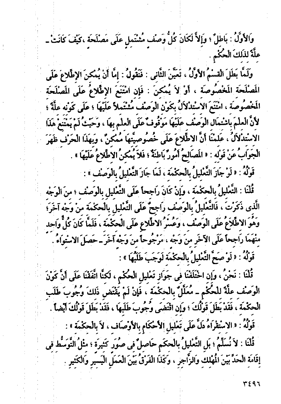 ولا بطل القسم الأول، تعين الثاني: فنقول: إما أن يمكن الإطلاع على المصلحة المخصوصة، أو لا يمكن: فإن امتنع الإطلاع على المصلحة المخصوصة، امتنع الاستدلال بكون الوصف مشتملا عليها؛ على كونه علة؛ لأن العلم باشتمال الوصف عليها موقوف على العلم بها، وحيث لم يمتنع هذا الاستدلال، علمنا أن الاطلاع على خصوصيتها ممكن، وبهذا الحرف ظهر الجواب عن قوله: "المصالح أمور باطنه؛ فلا يمكن الاطلاع عليها".