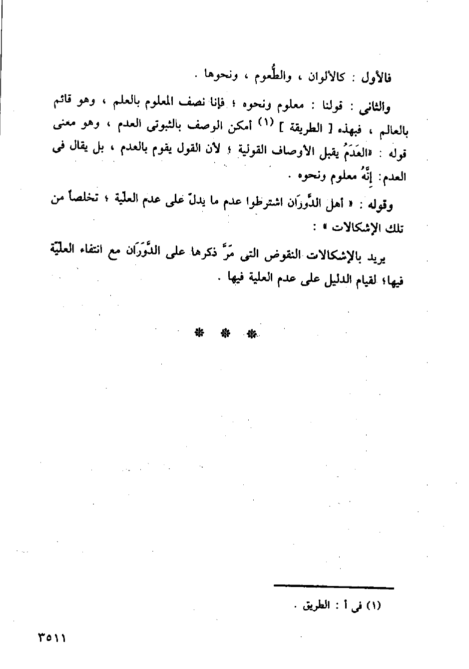 والثاني: قولنا: معلوم ونحوه؛ فإنا نصف المعلوم بالعلم، وهو قائم بالعالم، فبهذه [الطريقة] أمكن الوصف بألثبوتي العدم، وهو معنى قوله: "العدم يقبل الأوصاف القولية؛ لأن القول يقوم بالعدم، بل يقال في العدم: إنه معلوم ونحوه.