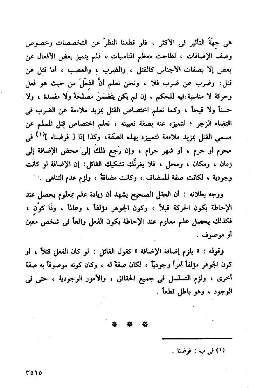 هي جهة التأثير في الأكثر، فلو قطعنا النظر عن التخصصات وخصوص وصف الإضافات، لطاحت معظم المناسبات، فلم يتميز بعض الأفعال عن بعض إلا بصفات الأجناس كالقتل، والضرب، والغصب، أما قتل عن قتل، وضرب عن ضرب فلا، ونحن نعلم أن الفعل من حيث هو فعل وحركة لا مناسبة فيه للحكم، إن لم يكن يتضمن مصلحة ولا مفسدة، ولا حسنا ولا قبحا، وكما نعلم اختصاص القتل بمزيد ملائمة عن الضرب في اقتضاء الزجر؛ لتميزه عنه بصفة تعيينه، نعلم اختصاص قتل المسلم عن مسمى القتل بمزيد ملائمة لتمييزه بهذه الصفة، وكذا إذا [فرضناه] في محرم أو حرم، أو شهر حرام، وإن رجع ذلك إلى محض الإضافة إلى زمان، ومكان، ومحل، فلا يغرنك تشكيك القائل: إن الإضافة لو كانت وجودية، لكانت صفة للمضاف، وكانت مضافة، ولزم عدم التناهي.