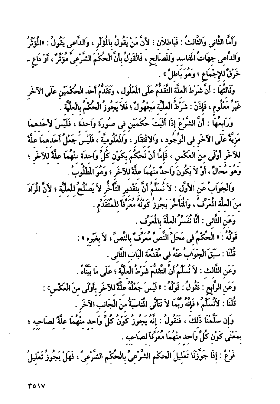 ورابعها: أن الشرع إذا أثبت حكمين في صورة واحدة، فليس لأحدهما مزية على الآخر في الوجود، والافتقار، والمعلومية، فليس جعل أحدهما علة للآخر أولى من العكس، فإما أن نحكم بكون كل واحدة منهما علة للآخر؛ وهو محال، أو لا يكون واحد منهما علة للآخر؛ وهو المطلوب.