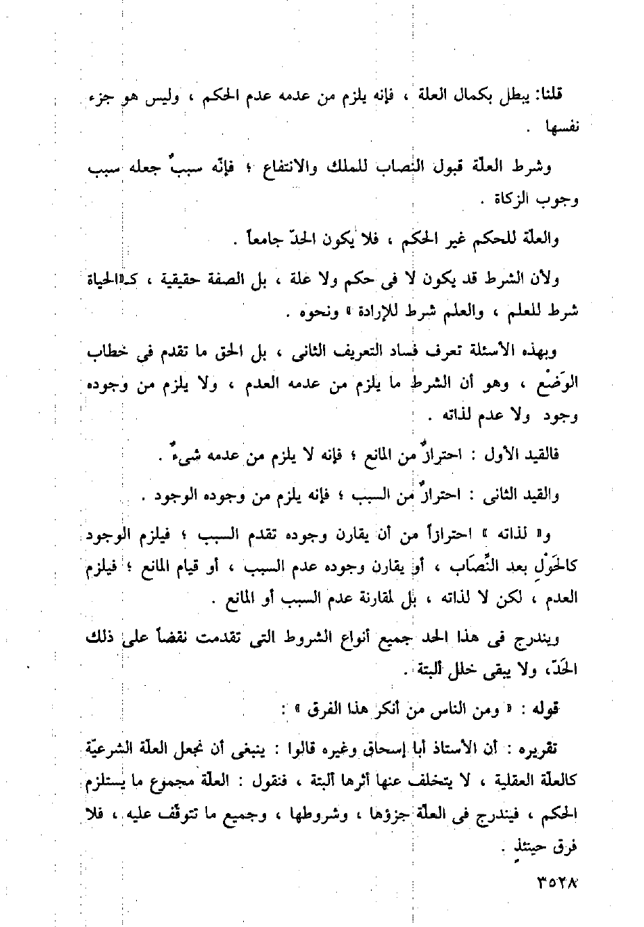 تقريره: أن الأستاذ إبا إسحاق وغيره قالوا: ينبغي أن نجعل العلة الشرعية كالعلة العقلية، لا يتخلف عنها أثرها ألبتة، فنقول: العلة مجموع ما يستلزم الحكم، فيندرج في العلة جزؤها، وشروطها، وجميع ما تتوقف عليه، فلا فرق حينئد.