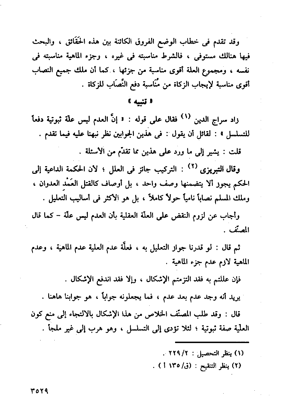 زاد سراج الدين فقال على قوله: "إن العدم ليس علة ثبوتية دفعا للتسلسل": لقائل أن يقول: في هذين الجوابين نظر نبهنا عليه فيما تقدم.