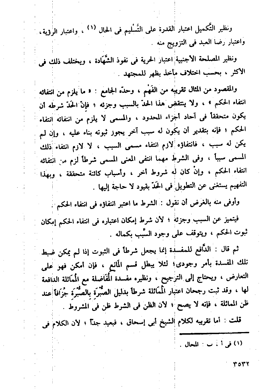 ثم قال: الدافع للمفسدة إنما يجعل شرطا في الثبوت إذا لم يمكن ضبط تلك المفسدة بأمر وجودى؛ لئلا يبطل قسم المانع، فإن أمكن فهو على التعارض، ويحتاج إلى الترجيح، ونظيره مفسدة المفاضلة مع المماثلة الدافعة لها، وقد ثبت رجحان اعتبار المماثلة شرطا بدليل الصبرة بالصبرة جزافا عند ظن المماثلة، فإنه لا يصح؛ لأن الظن في الشرط ظن في المشروط.