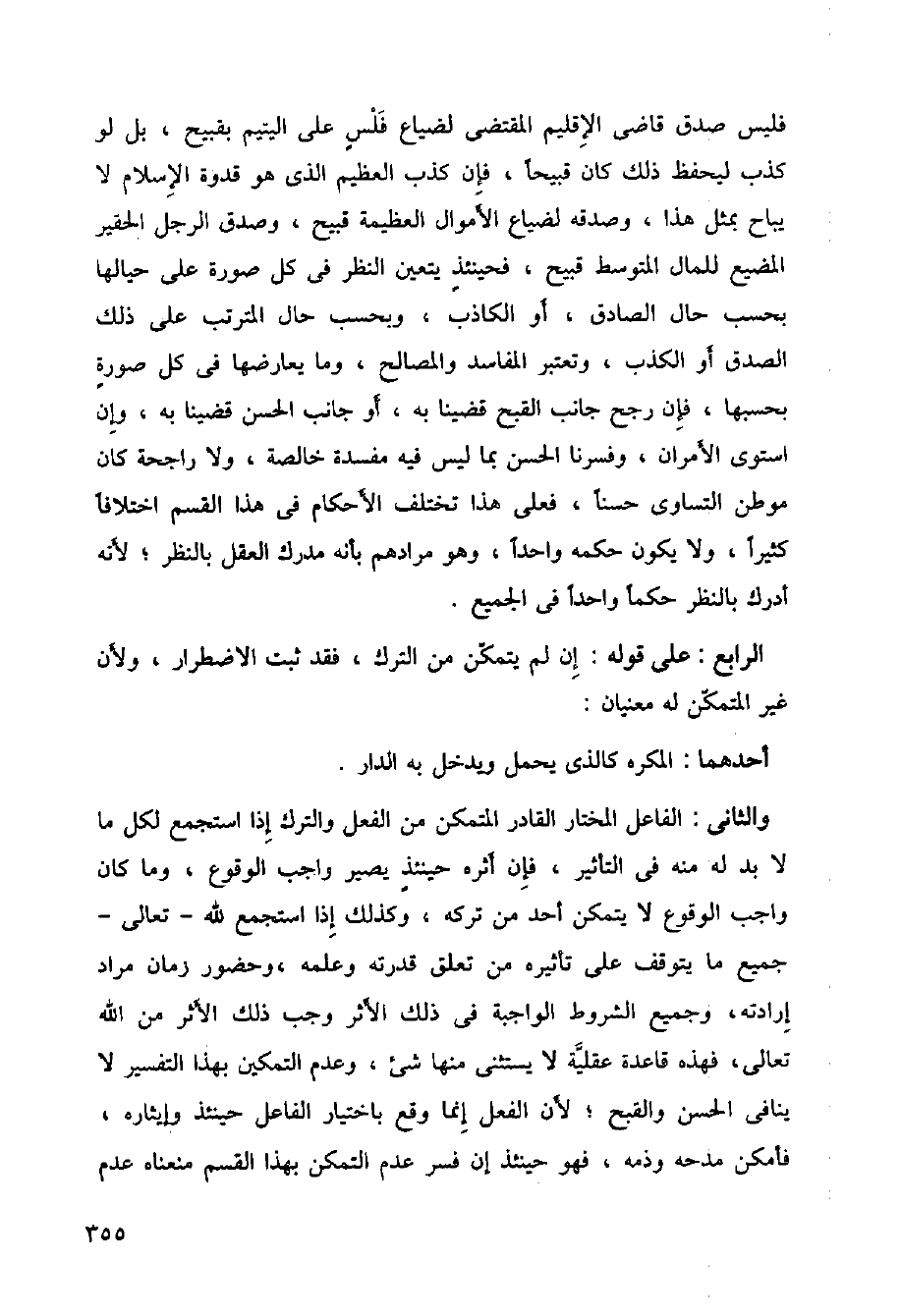والثاني: الفاعل المختار المتمكن من الفعل والترك إذا استجمع لكل ما لا بدل له منه في التأثير، فإن أثره حينئذ يصير واجب الوقوع، وما كان واجب الوقوع لا يتمكن أحد من تركه، وكذلك إذا استجمع لله - تعالى - جميع ما يتوقف على تأثيره من تعلق قدرته وعلمه، وحضور زمان مراد إرادته، وجميع الشروط الواجبة في ذلك الأثر وجب ذلك الأثر من الله تعالى، فهذه قاعدة عقلية لا يستثنى منها شيء، وعدم التمكين بهذا التفسير لا ينافي الحسن والقبح، لأن الفعل إنما وقع باختيار الفاعل حينئذ وإيثاره، فأمكن مدحه وذمه، فهو حينئذ إن فسر عدم التمكن بهذا القسم منعناه عدم