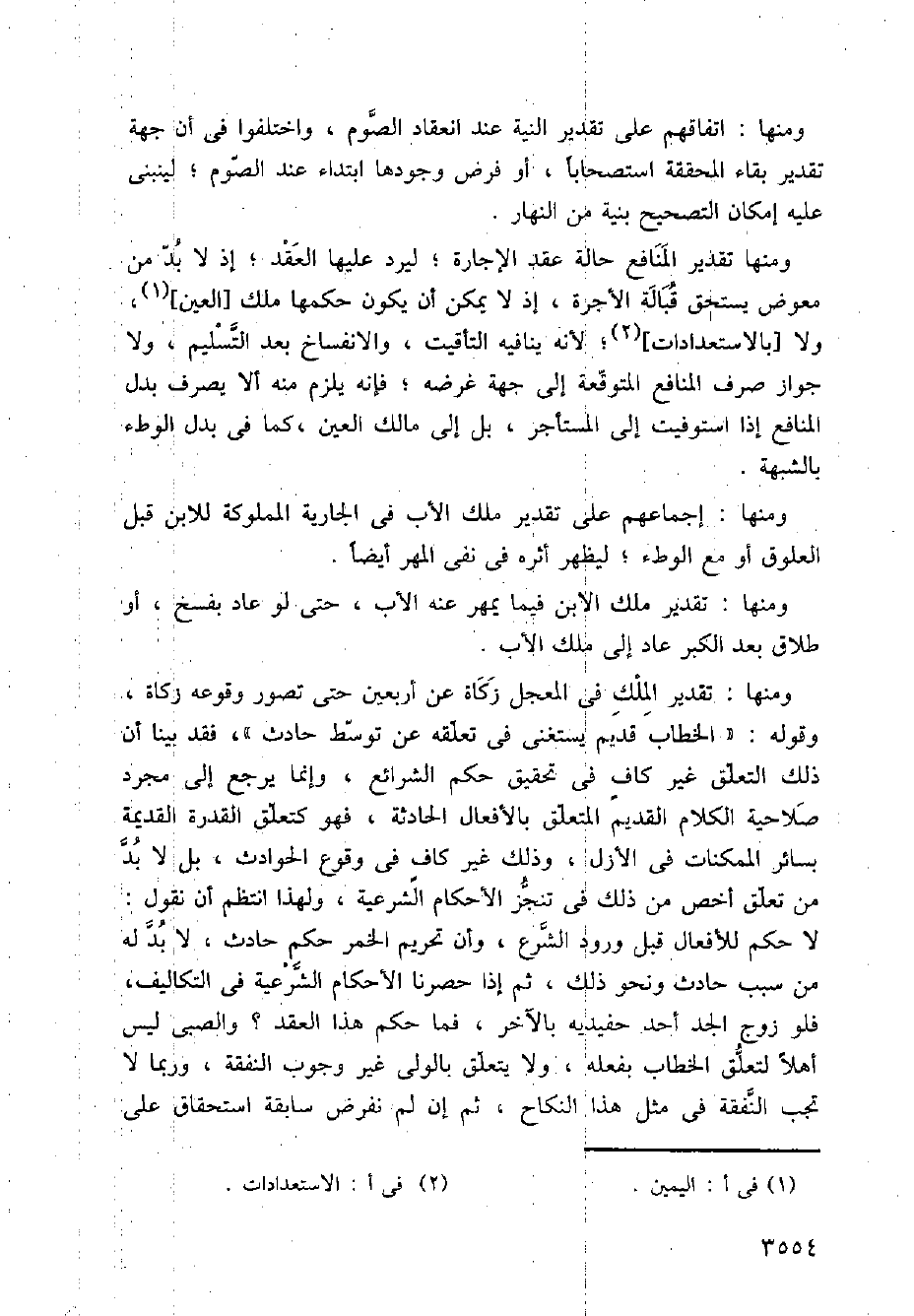 ومنها: تقدير الملك في المعجل زكاة عن أربعين حتى تصور وقوعه زكاة، وقوله: (الخطاب قديم يستغنى في تعلقه عن توسط حادث)، فقد بينا أن ذلك التعلق غير كاف في تحقيق حكم الشرائع، وإنما يرجع إلى مجرد صلاحية الكلام القديم المتعلق بالأفعال الحادثة، فهو كتعلق القدرة القديمة بسائر الممكنات في الأزل، وذلك غير كاف في وقوع الحوادث، بل لا بد من تعلق أخص من ذلك في تنجز الأحكام الشرعية، ولهذا انتظم أن نقول: لا حكم للأفعال قيل ورود الشرع، وأن تحريم الخمر حكم حادث، لا بد له من سبب حادث ونحو ذلك، ثم إذا حصرنا الأحكام الشرعية في التكاليف، فلو زوج الجد أحد حفيديه بالآخر، فما حكم هذا العقد؟ والصبي ليس أهلا لتعلق الخطاب بفعله، ولا يتعلق بالولي غير وجوب النفقة، وربما لا تجب النفقة في مثل هذا النكاح، ثم إن لم نفرض سابقة استحقاق على
