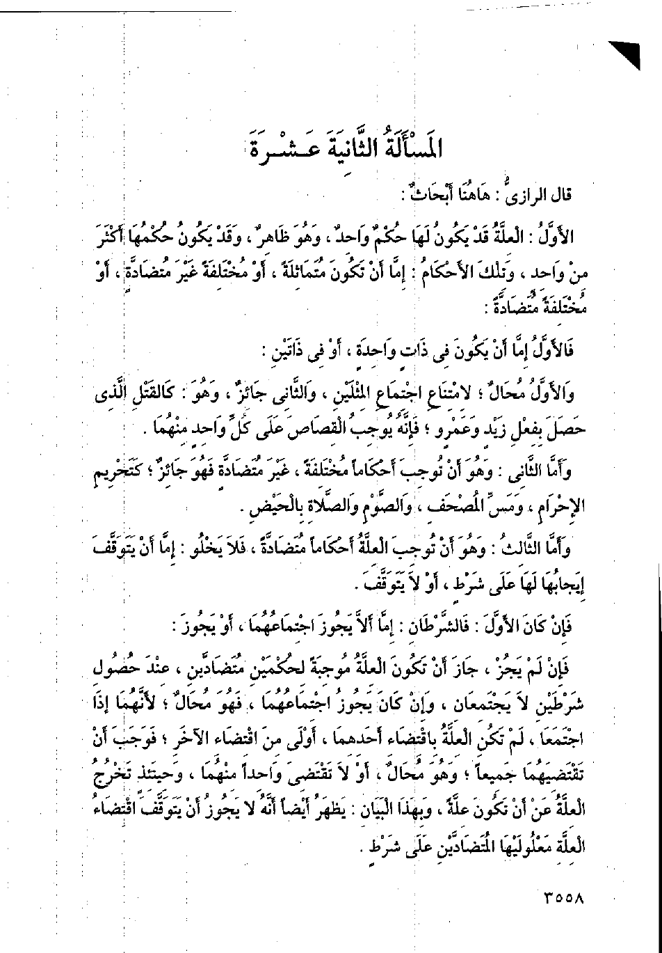 الأول: العلة قد يكون لها حكم واحد، وهو ظاهر، وقد يكون حكمها أكثر من واحد، وتلك الأحكام: إما أن تكون متماثلة، أو مختلفة غير متضادة، أو مختلفة متضادة: