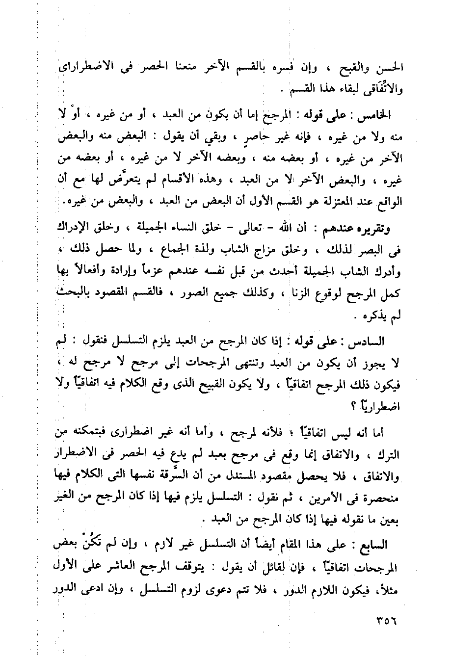 السادس: على قوله: إذا كن المرجح من العبد يلزم التسلسل فنقول: لم لايمجوز أن يكون من العبد وتنتهي المرجحات إلى مرجح لا مرجح له، فيكون ذلك المرجح اتفاقيا، ولا يكون القبيح الذي وقع الكلام فيه اتفاقيا ولا اضطراريا؟