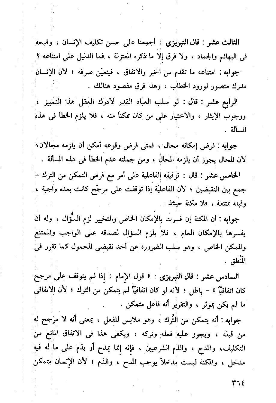 الثالث عشر: قال التبريزي: أجمعنا على حسن تكليف الإنسان، وقبحه في البهائم والجماد، ولا فرق إلا ما ذكره المعتزلة، فما الدليل على امتناعه؟
