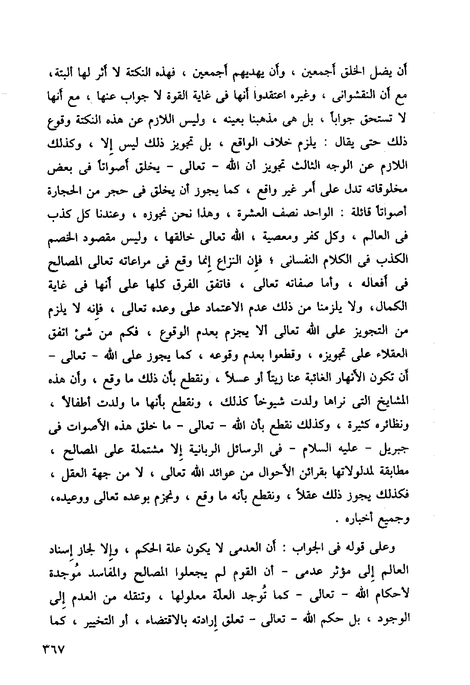 أن يضل الخلق أجمعين، وأن يهديهم أجمعين، فهذه النكتة لا أثر لها ألبتة، مع أن النقشواني، وغيره اعتقدوا أنها في غاية القوة لا جواب عنها، مع أنها لا تستحق جوابا، بل هي مذهبنا بعينه، وليس اللازم عن هذه النكتة وقوع ذلك حتى يقال: يلزم خلاف الواقع، بل تجويز ذلك ليس إلا، وكذلك اللازم عن الوجه الثاث تجويز أن الله - تعالى - يخلق أصواتا في بعض مخلوقاته تدل على أمر غير واقع، كما يجوز أن يخلق في حجر من الحجارة أصواتا قائلة: الواحد نصف العشرة، وهذا نحن نجوزه، وعدنا كل كذب في العالم، وكل كفر ومعصية، الله تعالى خالقها، وليس مقصود الخصم الكذب في الكلام النفساني، فإن النزاع إنما وقع في مراعاته تعالى المصالح في أفعاله، وأما صفاته تعالى، فاتفق الفرق كلها على أنها في غاية الكمال، ولا يلزمنا من ذلك عدم الإعتماد على وعده تعالى، فإنه لا يلزم من التجويز على الله تعالى ألا يجزم بعدمالوقوع، فكم من شيء اتفق العقلاء على تجويزه، وقطعوا بعدم وقوعه، كما يجوز على الله تعالى أن تكون الأنهار الغائبة عنا زيتا أو عسلا، ونقطع بأن ذلك ما وقع، وأن هذه المشايخ التي نراها ولدت شيوخا كذلك، ونقطع بأنها ما ولدت أطفالا، ونظائره كثيرة، وكذلك نقطع بأن الله تعالى ما خلق هذه الأصوات في جبريل عليه السلام في الرسائل الربانية إلا مشتملة على المصالح، مطابقة لمدلولاتها بقرائن الأحوال من عوائد الله تعالى، لا من جهة العقل، فكذلك يجوز ذلك عقلا، ونقطع بأنه ما وقع، ونجزم بوعده تعالى ووعيده، وجميع أخباره.