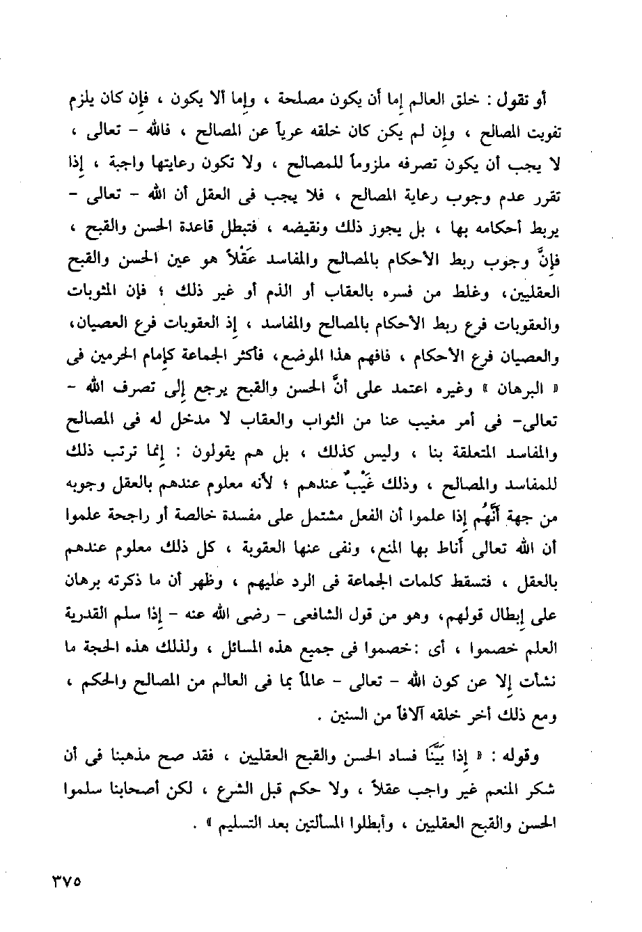 أو تقول: خلق العالم إما أن يكون مصلحة، وإما ألا يكون، فإن كان يلزم تفويت المصالح، وإن لم يكن كان خلقه عريا عن المصالح، فالله تعالى، لا يجب أن يكون تصرفه ملزوما للمصالح، ولا تكون راعيتها واجبة، إذا تقرر عدم وجوب رعاية المصالح، فلا يجب في العقل أن الله تعالى يربط أحكامه بها، بل يجوز ذلك ونقيضه، فتبطل قاعدة الحسن والقبح العقليين، وغلط من فسره بالعقاب أو الذم أو غير ذلك، فإن المثوبات والعقوبات فرع ربط الأحكام بالمصالح والمفاسد، إذ العقوبات فرع العصيان، والعصيان فرع الأحكام، فافهم هذا الموضع، فأكثر الجماعة كإمام الحرمين في "البرهان" وغيره اعتمد على أن الحسن والقبح يرجع إلى تصرف الله تعالى في أمر مغيب عنا من الثواب والعقاب لا مدخل له في المصالح والمفاسد المتعلقة بنا، وليس كذلك، بل هم يقولون: إنما ترتب ذلك للمفاسد والمصالح، وذلك غيب عندهم، لأنه معلوم عندهم بالعقل وجوبه منجهة أنهم إذا علموا أن الفعل مشتمل على مفسدة خالصة أو راجحة علموا أن اللهتعالى أناط بها المنع، ونفي عنها العقوبة، كل ذلك معلوم عندهم بالعقل، فتسقط كلمات الجماعة في الرد عليهم، وظهر أن ما ذكرته برهان على إبطال قولهم، وهو من قول الشافعي رضي الله عنه إذا سلم القدرية العلم خصموا، أي: خصموا في جيمع هذه المسائل، ولذلك هذه الحجة ما نشأت إلا عن كون الله تعالى عالما بما في العالم من المصالح والحكم، ومع ذلك أخر خلقه آلافا من السنين.