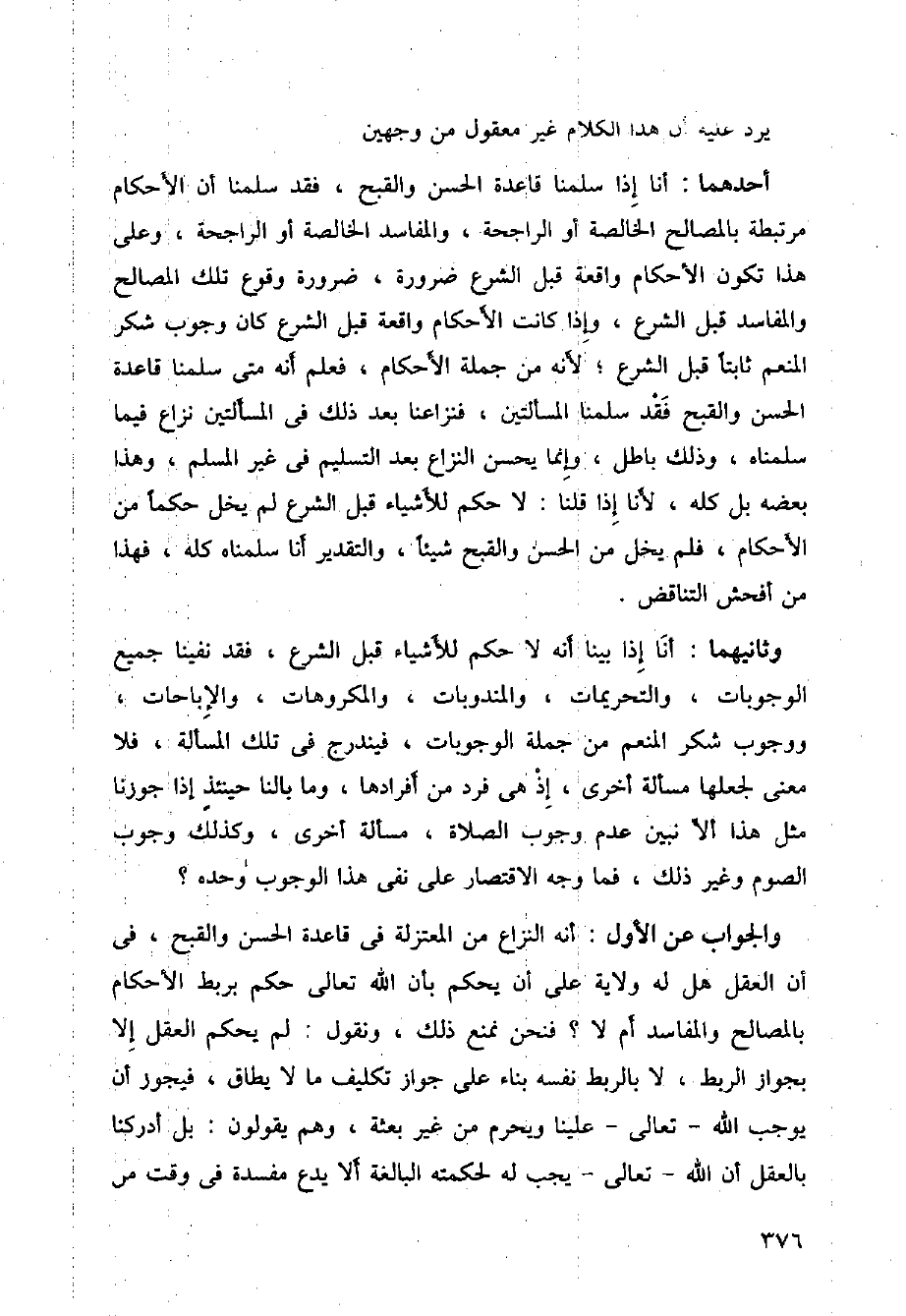 أحدهما: أن إذا سلمنا قاعدة الحسن والقبح، فقد سلمنا أن الأحكام مرتبطة بالمصالح الخالصة أو الراجحة، والمفاسد الخالصة أو الراجحة، وعلى هذا تكون الأحكام واقعة قبل الشرع ضرورة، ضرورة وقووع تلك المصالح والمفاسد قبل الشرع، وإذا كانت الاحكام واقعة قبل الشرع كان وجوب شكر المنعم ثابتا قبل الشرع، لأنه من جملة الأحكام، فعلم أنه متى سلمنا قاعدة الحسن والقبح فقد سلمنا المسألتين، فنزاعنا بعد ذلك في المسألتين نزاع فيما سلمناه، وذلك باطل، وإنما يحسن النزاع بعد التسليم في غير المسلم، وهذا بعضه بل كله، لأنا إذا قلنا: لا حكم للأشياء قبل الشرع لم يخل حكما من الاحكام، فلم يخل من الحسن والقبخ شيئا، والتقدير أنا سلمناه كله، فهذا من أفحش التناقض.