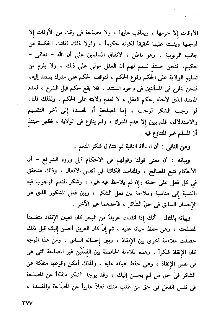 وبيانه بالمثال: أنك إذا أنقضت غريقا من البحر كان تعيين الإنقاذ متضمنا لمصلحته، وهي حفظ حياته عليه، ثم إن كان الغريق أحسن إليك قبل ذلك حصلت ملاءمة أخرى بين الإنقاذ، وبين إحسانه السابق، ومن هذا الوجه كان الإنقاذ شكرا، وهذه الملاءمة الحاصلة بين الفعلين غير المصلحة التي هي في نفس الإنقاذ وهي حفظ حياته عليه، ولذلك أمكن وقوعها منفكة عن الشكر في حق من لم يحسن إليك، وقد يوجد الشكر منفكا عن المصلحة في نفس الفعل في حق من طلب منك فعلا عاريا عن المصلحة والمفسدة.