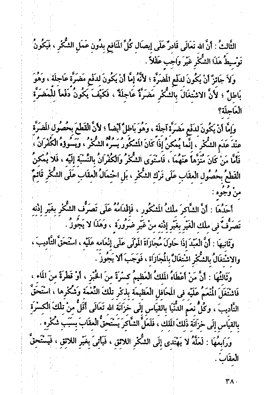 وأما أن يكون لدفع مضرة آجلة، وهو باطل أيضا لأن القطع بحصول المضرة عند عدم الشكر إنما يمكن إذا كان المشكور يسره الشكر ويسوءه الكفران فأما من كان منزها عنهما فاستوى الشكر والكفران بالنسبة إليه فلا يمكن القطع بحصول العقاب على ترك الشكر بل احتمال العقاب على الشكر قائم من وجوه: