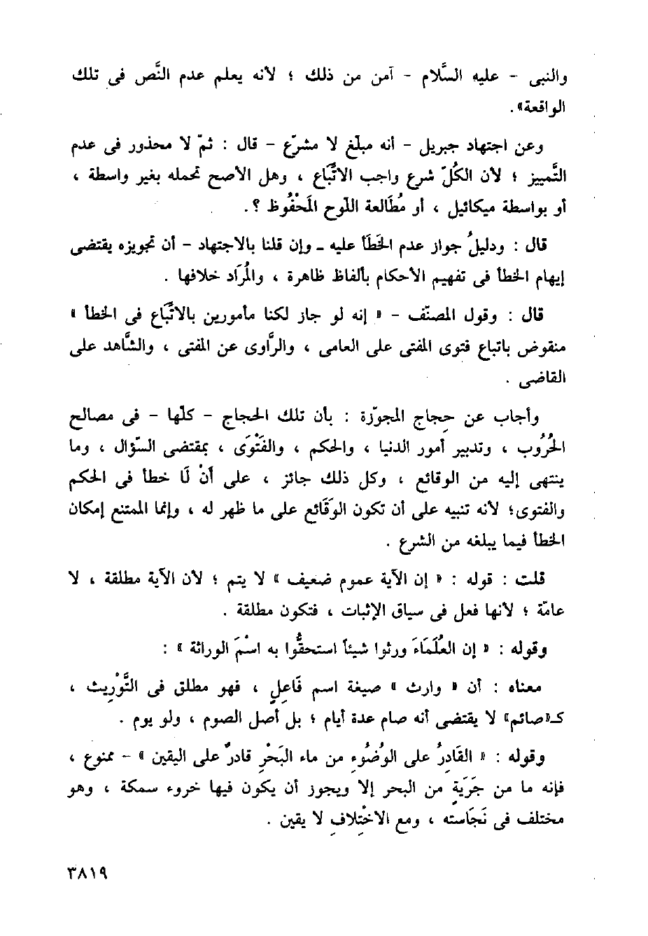 وأجاب عن حجاج المجوزة: بأن تلك الحجاج - كلها - في مصالح الحروب، وتدبير أمور الدنيا، والحكم، والفتوى، بمقتضي السؤال، وما ينتهي إليه من الوقائع، وكل ذلك جائز، على أن لا خطأ في الحكم والفتوى؛ لأنه تنبيه على أن تكون الوقائع على ما ظهر له، وإنما الممتنع إمكان الخطأ فيما يبلغه من الشرع.