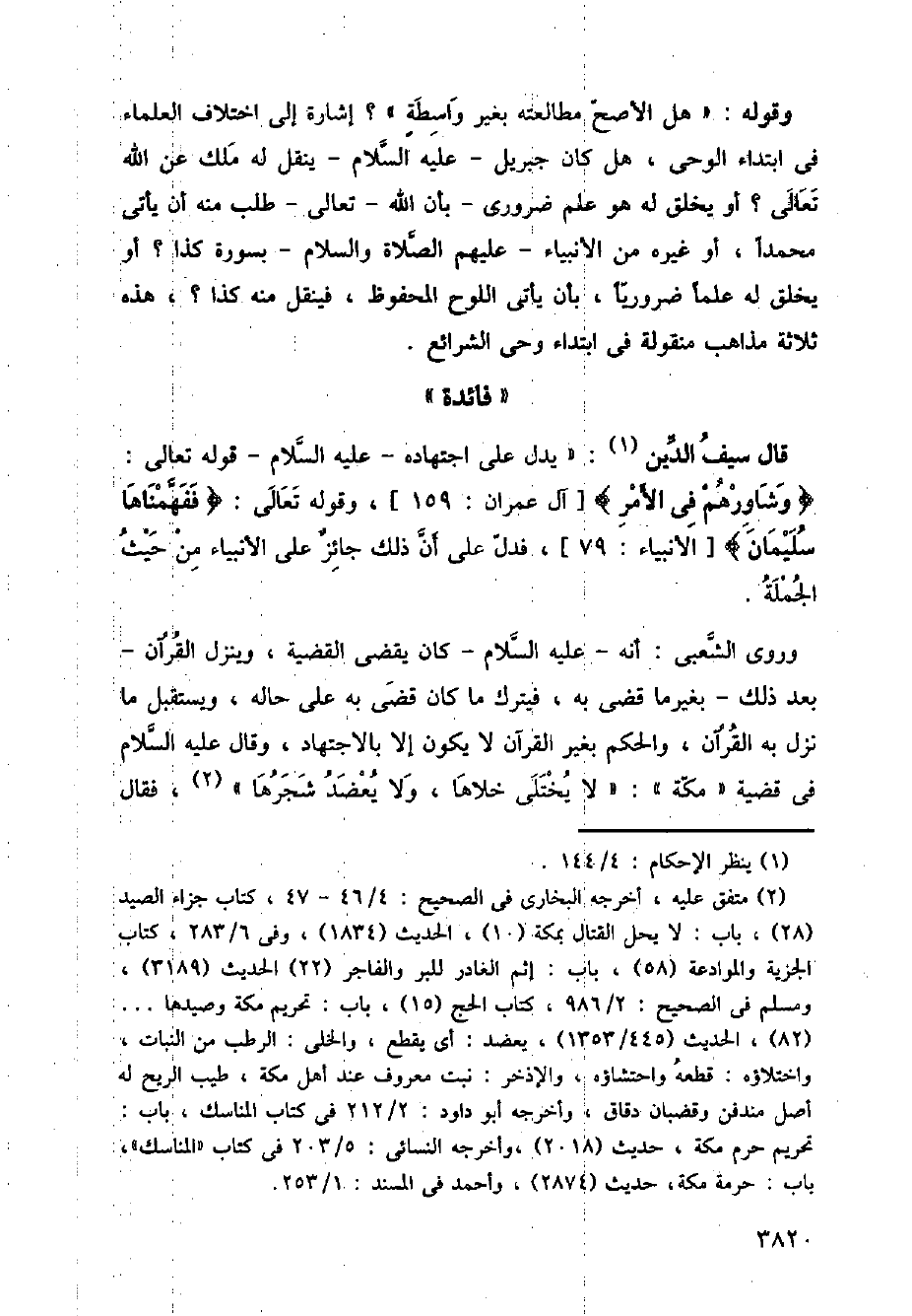 قال سيف الدين: (يدل على اجتهاده - عليه السلام - قوله تعالى:} وشاورهم في الأمر {، وقوله تعالى:} ففهمناها سليمان {، فدل على أن ذلك جائز على الأنبياء من حيث الجملة.