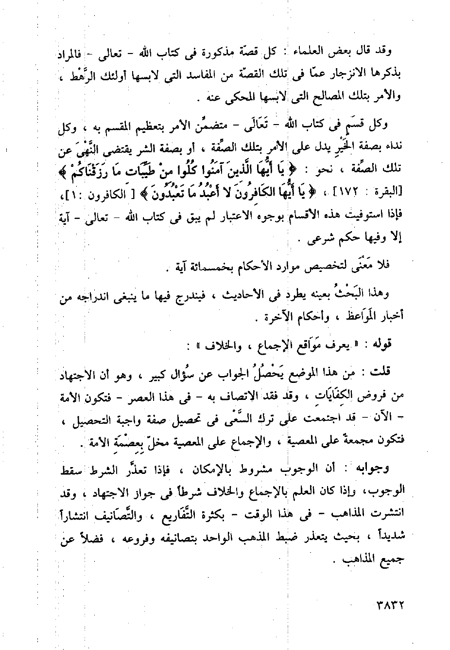 قلت: من هذا الموضع يحصل الجواب عن سؤال كبير، وهو أن الاجتهاد من فروض الكفايات، وقد فقد الاتصاف به - في هذا العصر - فتكون الأمة - الآن - قد اجتمعت على ترك السعي في تحصيل صفة واجبة التحصيل، فتكون مجمعة على المعصية، والإجماع على المعصية مخل بعصمة الأمة.