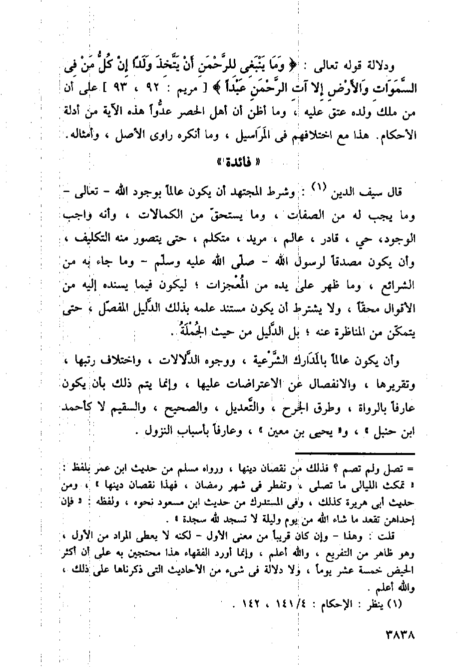 قال سيف الدين: وشرط المجتهد أن يكون عالمًا بوجود الله - تعالى - وما يجب له من الصفات، وما يستحق من الكمالات، وأنه واجب الوجود، حي، قادر، عالم، مريد، متكلم، حتى يتصور منه التكليف، وأن يكون مصدقًا لرسول الله - صلى الله عليه وسلم - وما جاء به من الشرائع، وما ظهر على يده من المعجزات؛ ليكون فيما يسنده إليه من الأقوال محقًا، ولا يشترط أن يكون مستند علمه بذلك الدليل المفصل، حتى يتمكن من المناظرة عنه؛ بل الدليل من حيث الجملة.
