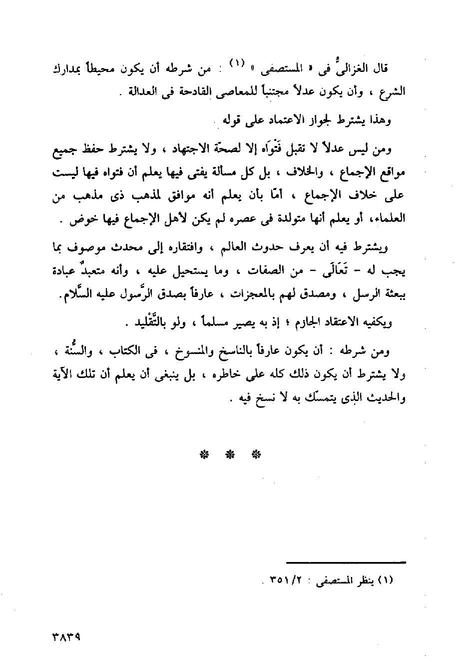 قال الغزالي في (المستصفى): من شرطه أن يكون محيطًا بمدارك الشرع، وأن يكون عدلاً مجتنبًا للمعاصي القادحة في العدالة.