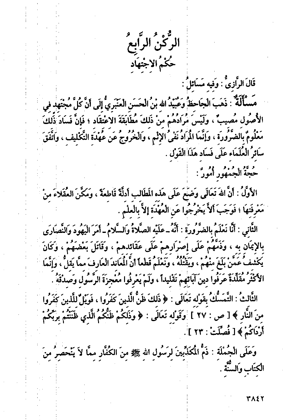 مسألة: ذهب الجاحظ وعبيد الله بن الحسن العنبري إلى أن كل مجتهد في الأصول مصيب، وليس مرادهم من ذلك مطابقة الاعتقاد؛ فإن فساد ذلك معلوم بالضرورة، وإنما المراد نفي الإثم، والخروج عن عهدة التكليف، واتفق سائر العلماء على فساد هذا القول.