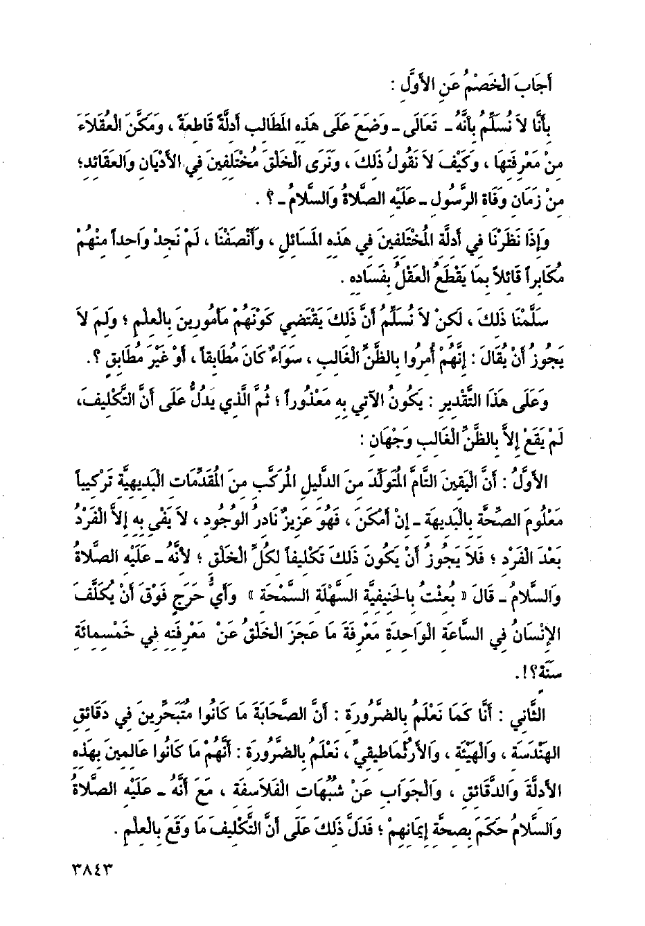 الأول: أن اليقين التام المتولد من الدليل المركب من المقدمات البديهية تركيبًا معلوم الصحة بالبديهة - إن أمكن، فهو عزيز نادر الوجود، لا يفي به إلا الفرد بعد الفرد؛ فلا يجوز أن يكون ذلك تكليفًا لكل الخلق؛ لأنه - عليه الصلاة والسلام - قال (بعثت بالحنيفية السهلة السحمة) وأي حرج فوق أن يكلف الإنسان في الساعة الواحدة معرفة ما عجز الخلق عن معرفته في خمسمائة سنة؟!.