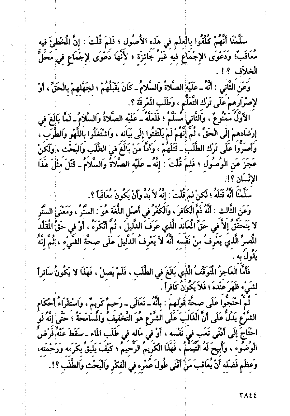 ثم احتجوا على صحة قولهم: بأنه - تعالى - رحيم كريم، واستقراء أحكام الشرع يدل على أن الغالب على الشرع هو التخفيف والمسامحة؛ حتى إنه لو احتاج إلى أدني تعب في نفسه، أو في ماله في طلب الماء - سقط عنه فرض الوضوء، وأبيح له التيمم، فهذا الكريم الرحيم؛ كيف يليق بكرمه ورحمته، وعظم فضله أن يعاقب من أفنى طول عمره في الفكر والبحث والطلب؟!.