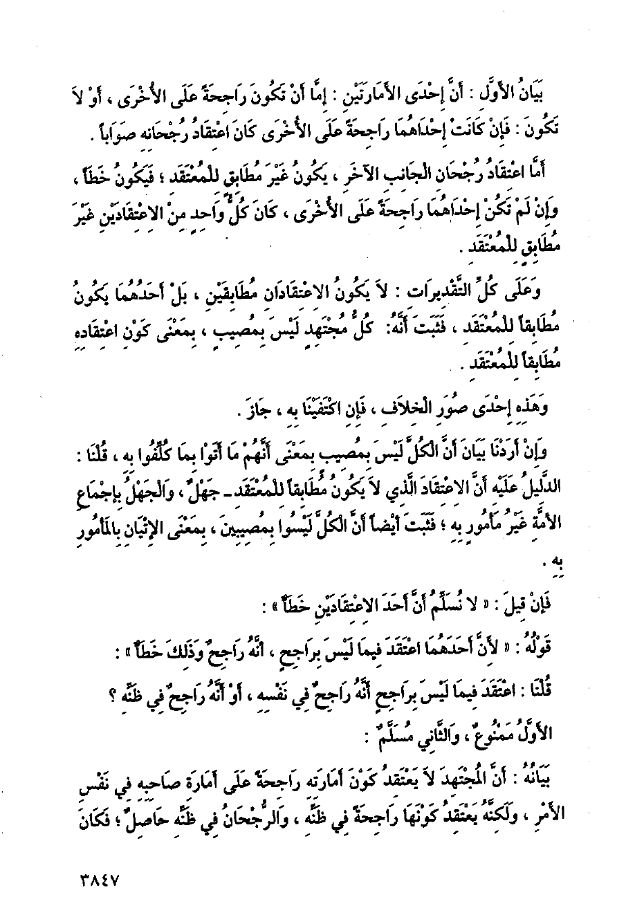 بيان الأول: أن إحدى الأمارتين: إما أن تكون راجحة على الأخرى، أو لا تكون: فإن كانت إحداهما راجحة على الأخرى كان اعتقاد رجحانه صوابًا.
