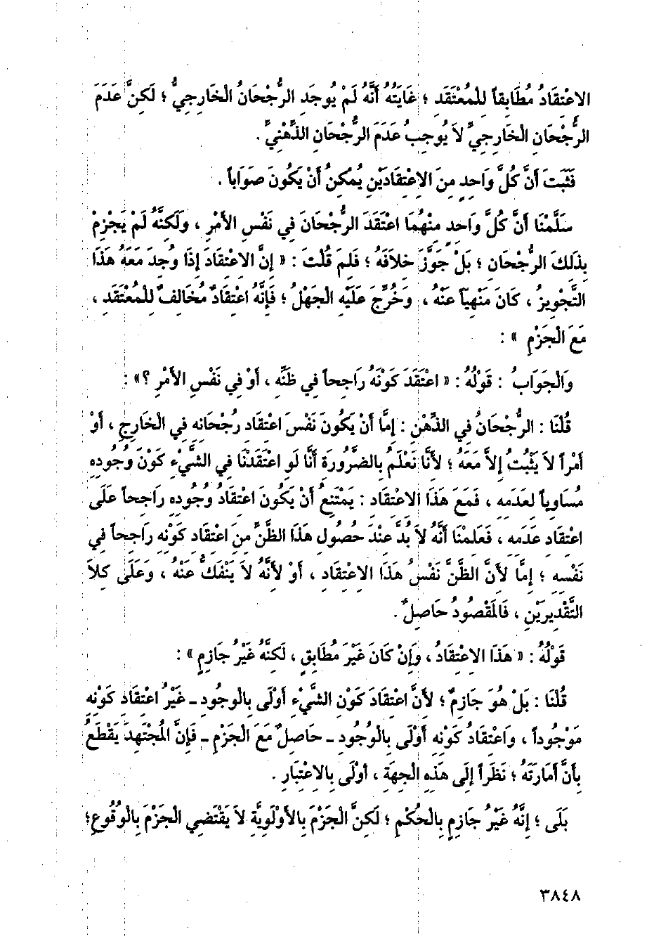 سلمنا أن كل واحد منهما اعتقد الرجحان في نفس الأمر، ولكنه لم يجزم بذلك الرجحان؛ بل جوز خلافه؛ فلم قلت: (إن الاعتقاد إذا وجد معه هذا التجويز، كان منهيًا عنه، وخرج عليه الجهل؛ فإنه اعتقاد مخالف للمعتقد، مع الجزم):