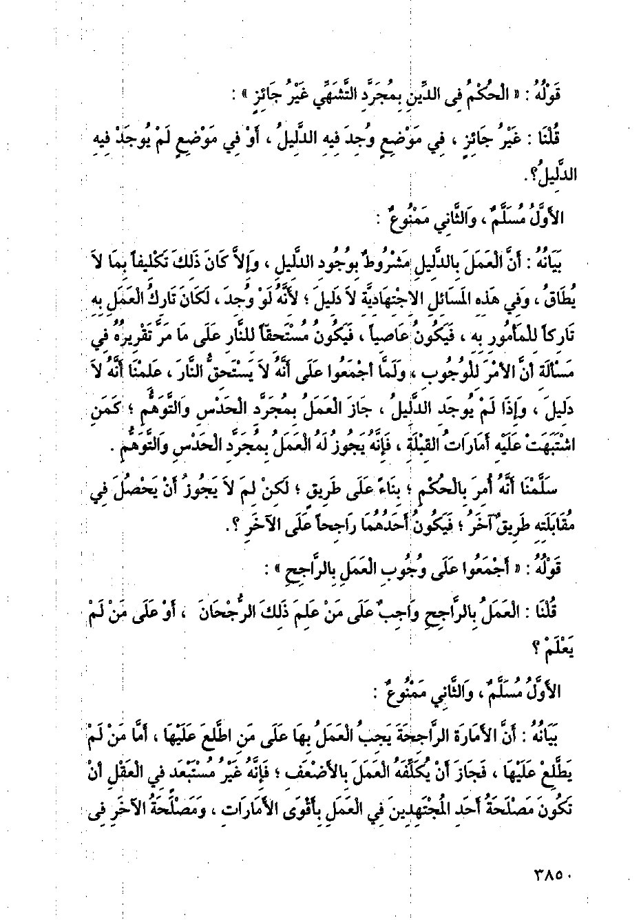 بيانه: أن العمل بالدليل مشروط بوجود الدليل، وإلا كان ذلك تكليفًا بما لا يطاق، وفي هذه المسائل الاجتهادية لا دليل؛ لأنه لو وجد، لكان تارك العمل به تاركًا للمأمور به، فيكون عاصيًا، فيكون مستحقًا للنار على ما مر تقريره في مسألة أن الأمر للوجوب، ولما أجمعوا على أنه لا يستحق النار، علمنا أنه لا دليل، وإذا لم يوجد الدليل، جاز العمل بمجرد الحدس والتوهم؛ كمن اشتبهت عليه أمارات القبلة، فإنه يجوز له العمل بمجرد الحدس والتوهم.