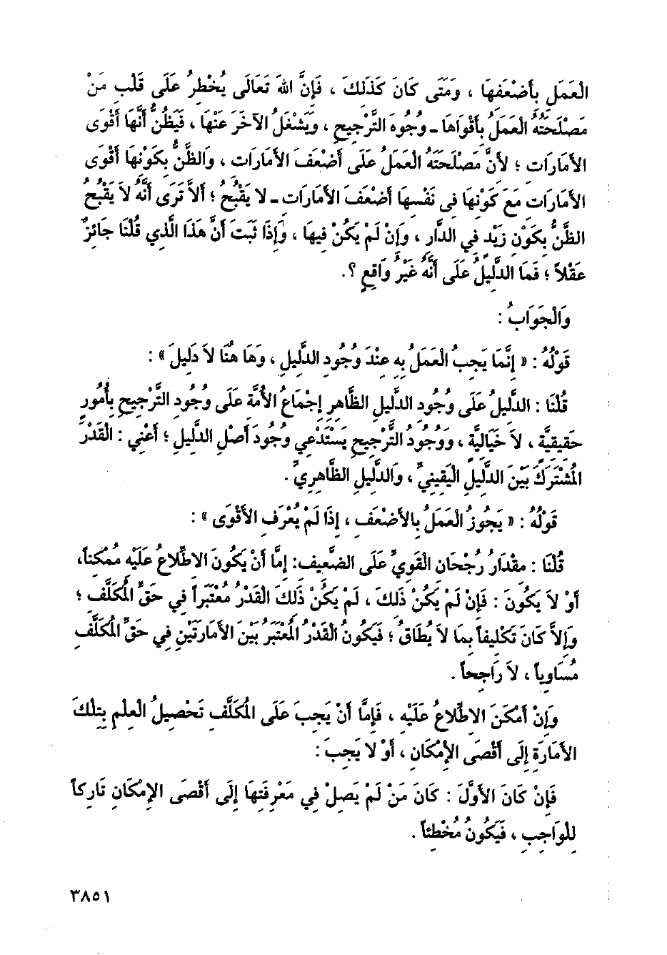 العمل بأضعفها، ومتى كان كذلك، فإن الله تعالى يخطر على قلب من مصلحته العمل بأقواها - وجوه الترجيح، ويشغل الآخر عنها، فيظن أنها أقوى الأمارات؛ لأن مصلحته العمل على أضعف الأمارات، والظن بكونها أقوى الأمارات مع كونها في نفسها أضعف الأمارات - لا يقبح؛ ألا ترى أنه لا يقبح الظن بكون زيد في الدار، وإن لم يكن فيها، وإذا ثبت أن هذا الذي قلنا جائز عقلاً؛ فما الدليل على أنه غير واقعٍ؟.