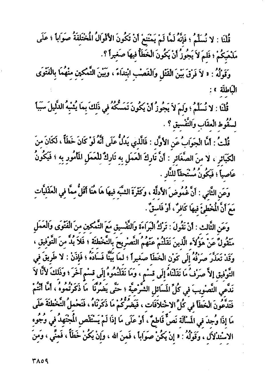 وعن الثالث: أن نقول: ترك البراءة والتفسيق مع التمكين من الفتوى والعمل منقول عن هؤلاء الذين نقلتم عنهم التصريح بالتخطئة؛ فلابد من التوفيق، وقد تعذر صرفه إلى كون الخطأ صغيرًا؛ لما بينا فساده؛ فإذن: لا طريق في التوفيق إلا صرف ما نقلناه إلى قسمٍ، وما نقلتموه إلى قسمٍ آخر؛ وذلك لأنا لا ندعي التصويب في كل المسائل الشرعية؛ حتى يضرنا ما ذكرتموه، أما أنتم فتدعون الخطأ في كل الاختلافات، فيضركم ما ذكرناه، فنحمل التخطئة على ما إذا وجد في المسألة نص قاطع، أو على ما إذا لم يستقص المجتهد في وجوه الاستدلال، وقوله: (إن يكن صوابًا، فمن الله، وإن يكن خطأ، فمني، ومن