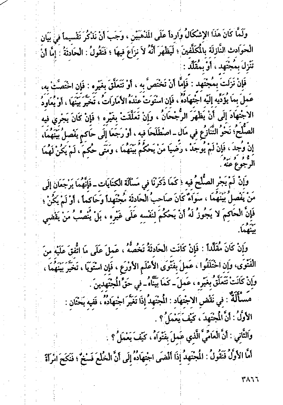 ولما كان هذا الإشكال واردًا على المذهبين، وجب أن نذكر تقسيمًا في باين الحوادث النازلة بالمكلفين؛ ليظهر أنه لا نزاع فيها؛ فنقول: الحادثة: إما أن تنزل بمجتهدٍ، أو بمقلدٍ: