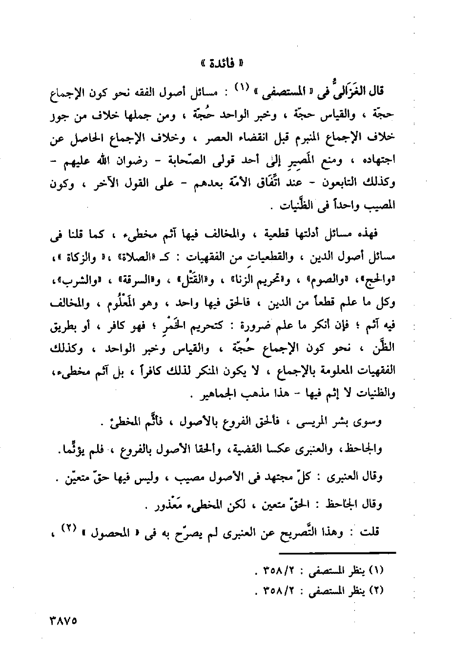 قال الغزالي في (المستصفى): مسائل أصول الفقه نحو كون الإجماع حجة، والقياس حجة، وخبر الواحد حجة، ومن جملها خلاف من جوز خلاف الإجماع المنبرم قبل انقضاء العصر، وخلاف الإجماع الحاصل عن اجتهاده، ومنع المصير إلى أحد قولي الصحابة - رضوان الله عليهم - وكذلك التابعون - عند اتفاق الأمة بعدهم - على القول الآخر، وكون المصيب واحدًا في الظنيات.