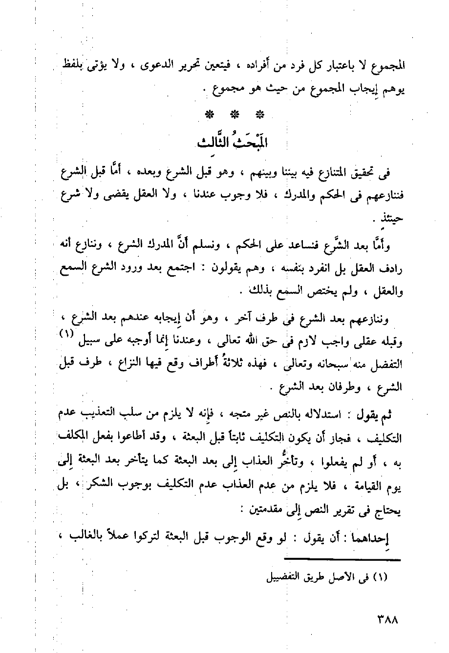 ثم يقول: استدلاله بالنص غير متجه، فإنه لا يلزم من سلب التعذيب عدم التكليف، فجاز أن يكون التكليف ثابتا قبل البعثة، وقد اطاعوا بفعل المكلف به، أو لم يفعلوا، وتأخر العذاب إلى بعد البعثة كما يتأخر بعد البعثة إلى يوم القيامة، فلا يلزم من عدم الغذاب عدم التكيلف بوجوب الشكر، بل يحتاج في تقرير النص إلى مقدمتين: