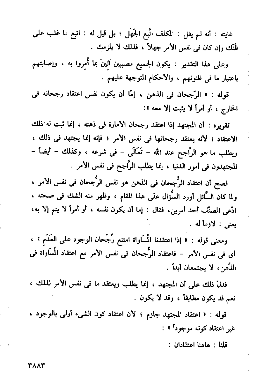 تقريره: أن المجتهد إذا اعتقد رجحان الأمارة في ذهنه، إنما ثبت له ذلك الاعتقاد؛ لأنه يعتقد رجحانها في نفس الأمر؛ فإنه إنما يجتهد في ذلك، ويطلب ما هو الراجح عند الله - تعالى - في شرعه، وكذلك - أيضًا - المجتهدون في أمور الدنيا، إنما يطلب الراجح في نفس الأمر.