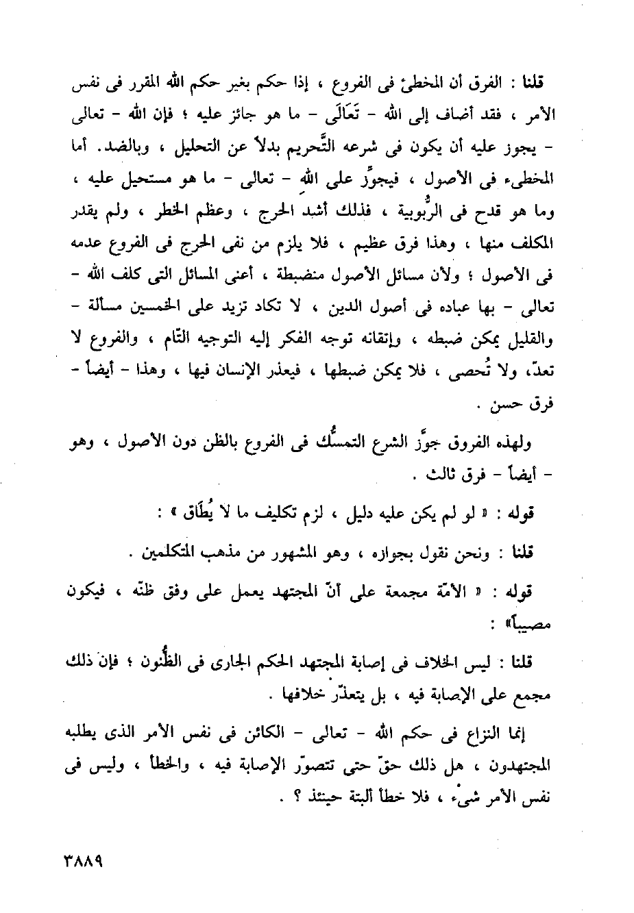 قلنا: الفرق أن المخطئ في الفروع، إذا حكم بغير حكم الله المقرر في نفس الأمر، فقد أضاف إلى الله - تعالى - ما هو جائز عليه؛ فإن الله - تعالى - يجوز عليه أن يكون في شرعه التحريم بدلاً عن التحليل، وبالضد. أما المخطئ في الأصول، فيجوز على الله - تعالى - ما هو مستحيل عليه، وما هو قدح في الربوبية، فذلك أشد الحرج، وعظم الخطر، ولم يقدر المكلف منها، وهذا فرق عظيم، فلا يلزم من نفي الحرج في الفروع عدمه في الأصول؛ ولأن مسائل الأصول منضبطة، أعنى المسائل التي كلف الله - تعالى - بها عباده في أصول الدين، لا تكاد تزيد على الخمسين مسألة - والقليل يمكن ضبطه، وإتقانه توجه الفكر إليه التوجيه التام، والفروع لا تعد، ولا تحصى، فلا يمكن ضبطها، فيعذر الإنسان فيها، وهذا - أيضًا - فرق حسن.