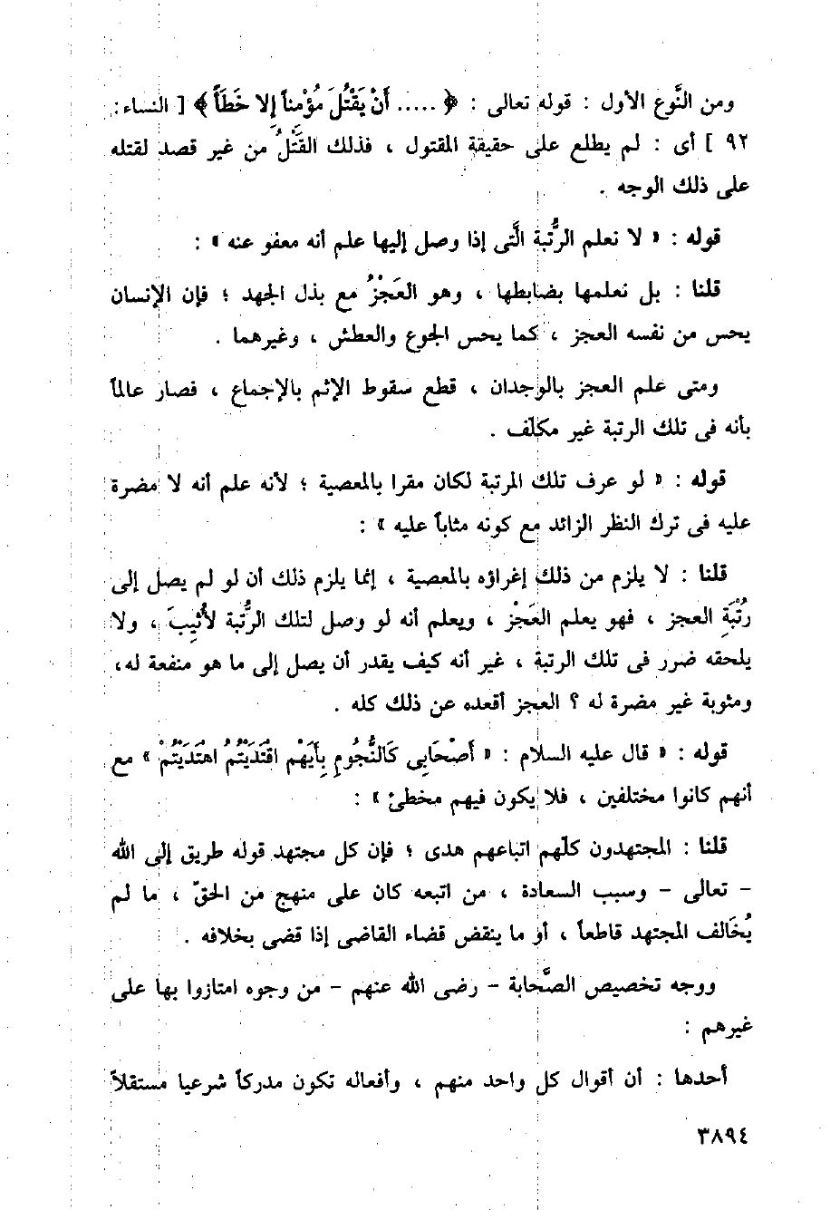 ومن النوع الأول: قوله تعالى:} .... أن يقتل مؤمنًا إلا خطًا {أي: لم يطلع على حقيقة المقتول، فذلك القتل من غير قصد لقتله على ذلك الوجه.