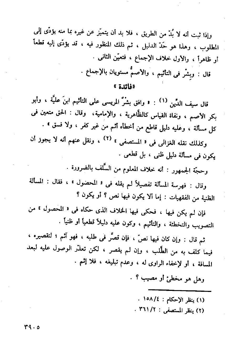 قال سيف الدين: (وافق بشر المريسي على التأثيم ابن علية، وأبو بكر الأصم، ونفاة القياس كالظاهرية، والإمامية، وقال: الحق متعين في كل مسألة، وعليه دليل قاطع من أخطأه أثم من غير كفر، ولا فسق).