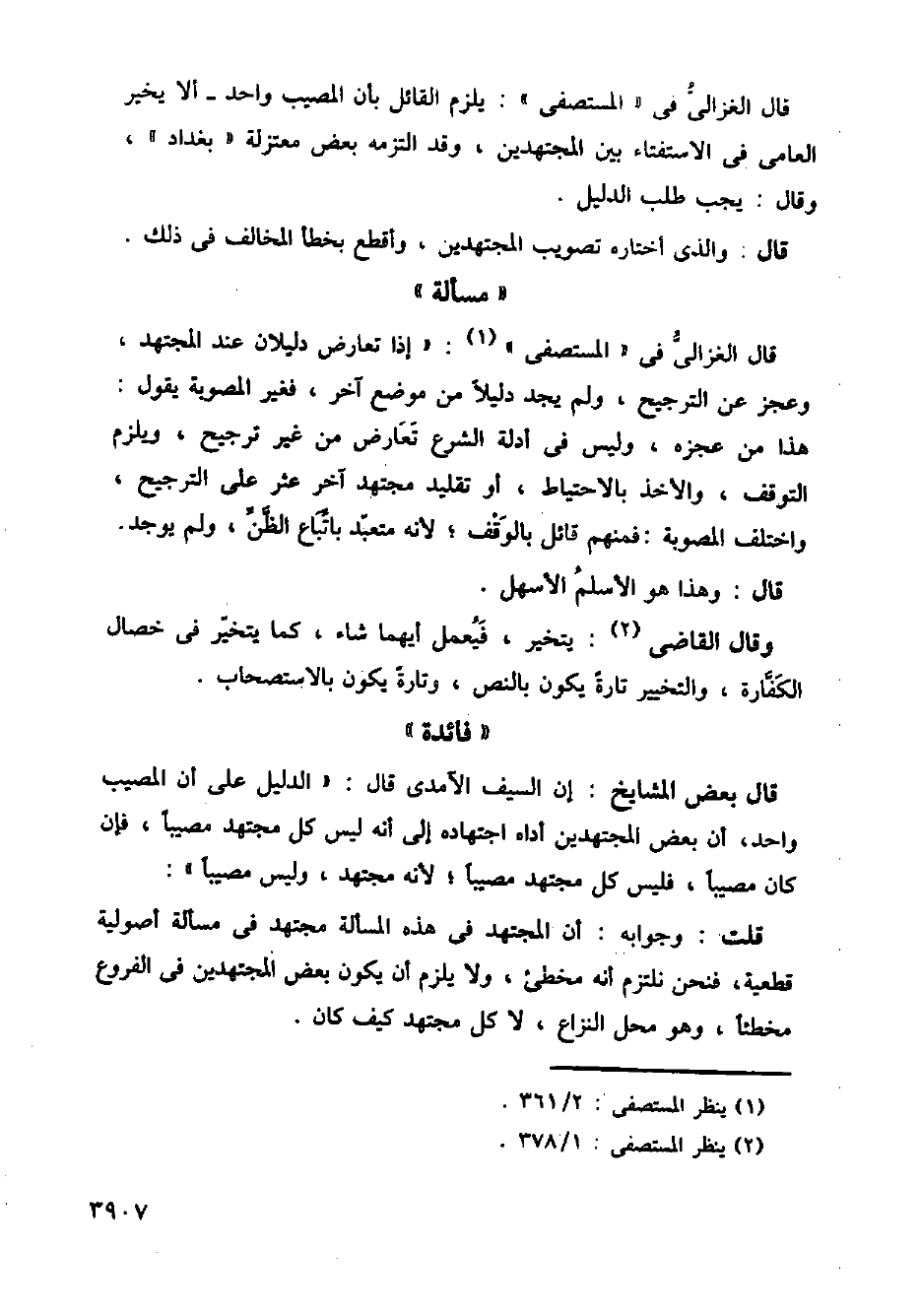 قال بعض المشايخ: إن السيف الآمدي قال: (الدليل على أن المصيب واحد، أن بعض المجتهدين أداه اجتهاده إلى أنه ليس كل مجتهد مصيبًا، فإن كان مصيبًا، فليس كل مجتهد مصيبًا؛ لأنه مجتهد، وليس مصيبًا):