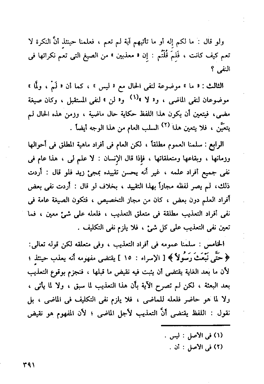 الثثالث: "ما"موضوعة لنفي الحال مع "ليس"كما أن "لم، ولما" موضوعان لنفي الماصي، و"لا" و"لن"لنفي المستقبل، وكان صيغة مضى، فيتعين أن يكون هذا لالفظ حكاية حال ماصية، وزمن هذه الحال لم يتعين، فلا يتعين هذا السلب العام من هذا الوجه أيضا.