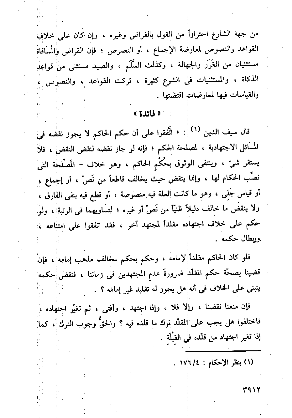 قال سيف الدين: (اتفقوا على أن حكم الحاكم لا يجوز نقضه في المسائل الاجتهادية، لمصلحة الحكم؛ فإنه لو جاز نقضه لنقض النقض، فلا يستقر شيء، وينتفي الوثوق بحكم الحاكم، وهو خلاف - المصلحة التي نصب الحكام لها، وإنما ينقض حيث يخالف قاطعًا من نص، أو إجماع، أو قياس جلى، وهو ما كانت العلة فيه منصوصة، أو قطع فيه بنفي الفارق، ولا ينقض ما خالف دليلاً ظنيًا من نص أو غيره؛ لتساويهما في الرتبة، ولو حكم على خلاف اجتهاده مقلدًا لمجتهد آخر، فقد اتفقوا على امتناعه، وإبطال حكمه.