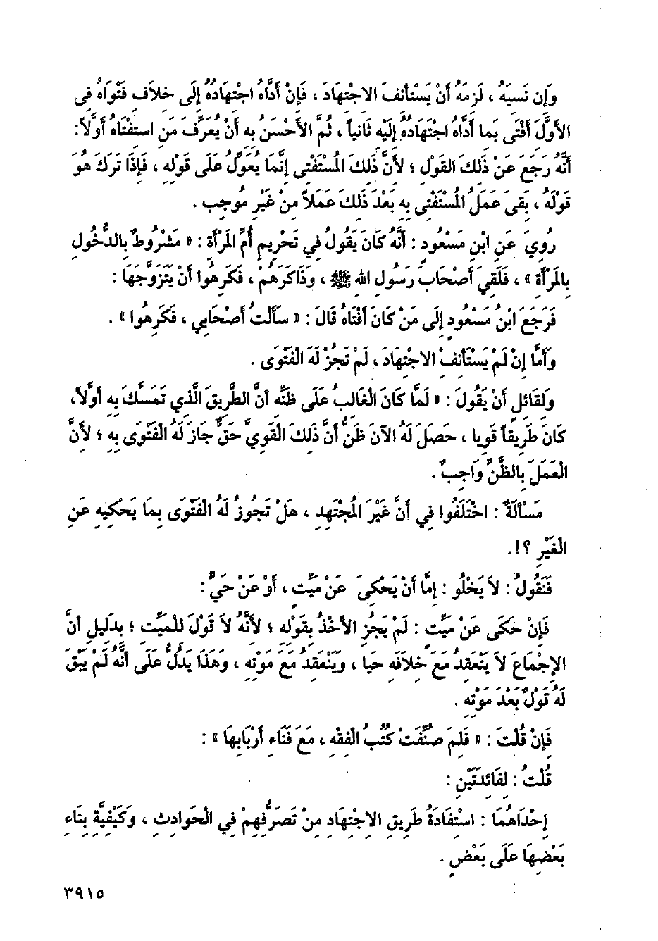 وإن نسيه، لزمه أن يستأنف الاجتهاد، فإن أداه اجتهاده إلى خلاف فتواه في الأول أفتى بما أداه اجتهاده إليه ثانيًا، ثم الأحسن به أن يعرف من استفتاه أولاً: أنه رجع عن ذلك القول؛ لأن ذلك المستفتي إنما يعول على قوله، فإذا ترك هو قوله، بقي عمل المستفتي به بعد ذلك عملاً من غير موجب.