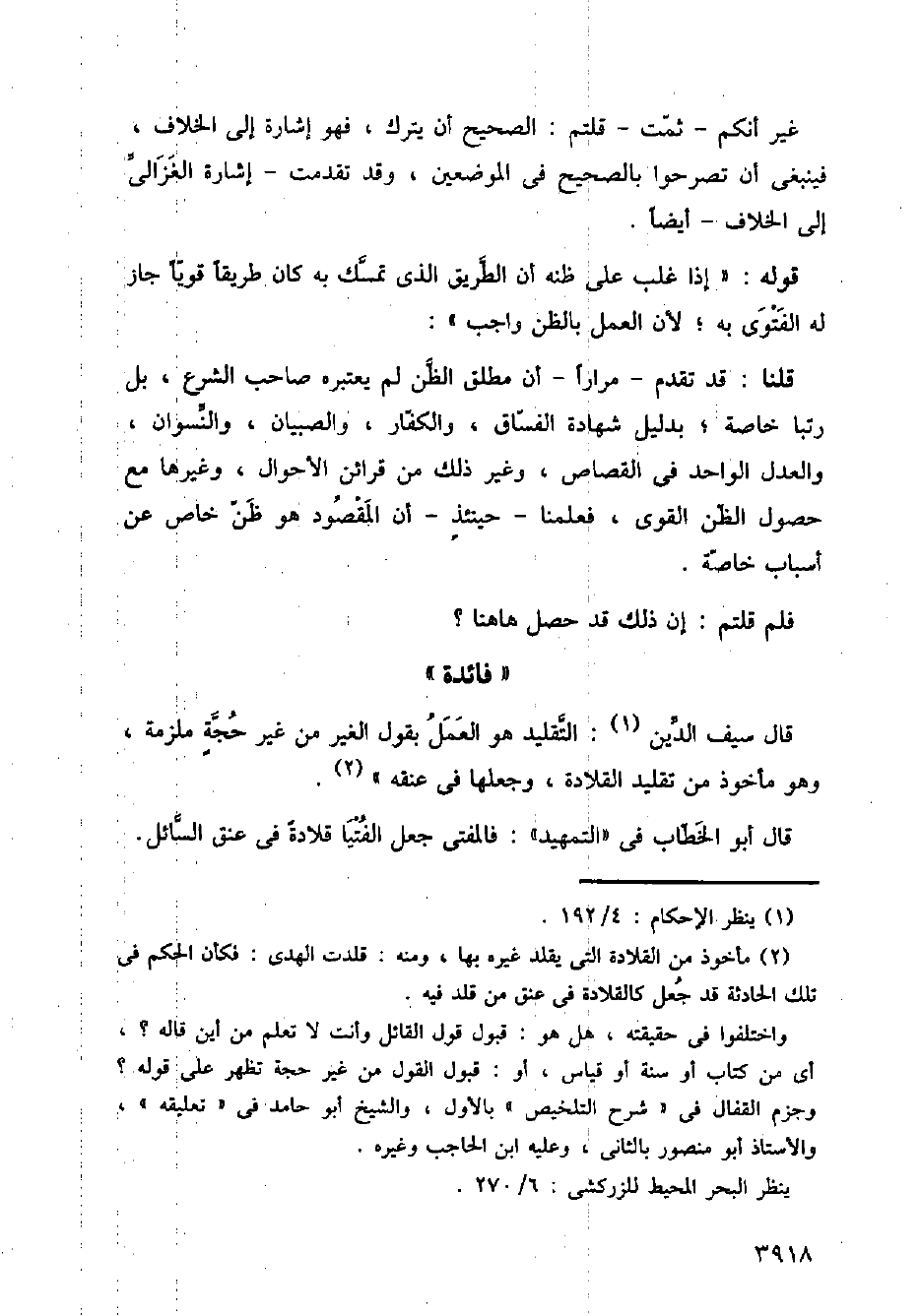 قال سيف الدين: التقليد هو العمل بقول الغير من غير حجةٍ ملزمة، وهو مأخوذ من تقليد القلادة، وجعلها في عنقه).