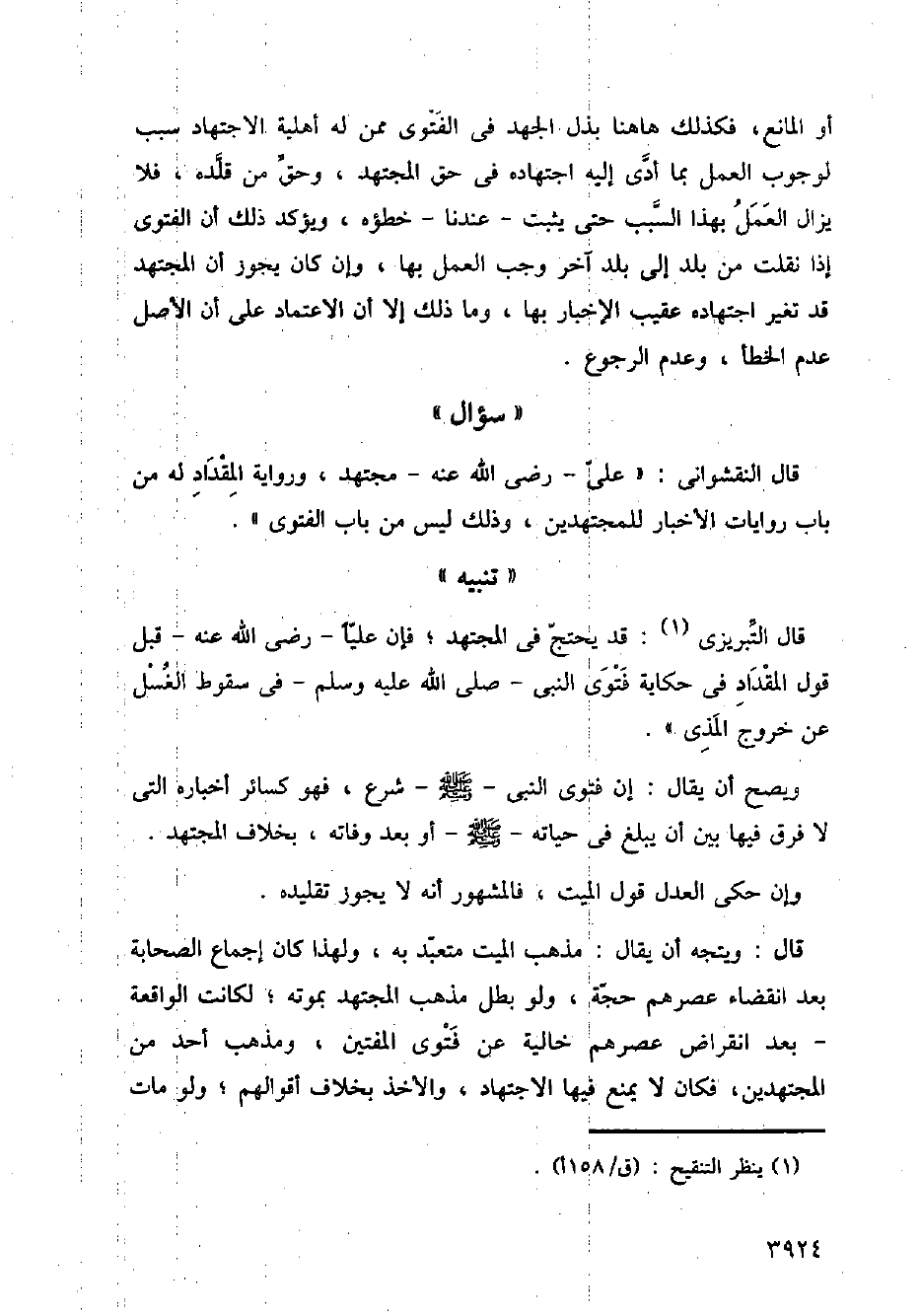 قال التبريزى: قد يحتج في المجتهد؛ قال عليًا - رضي الله عنه - قبل قول المقداد في حكاية فتوى النبي - صلى الله عليه وسلم - في سقوط الغسل عن خروج المذى).