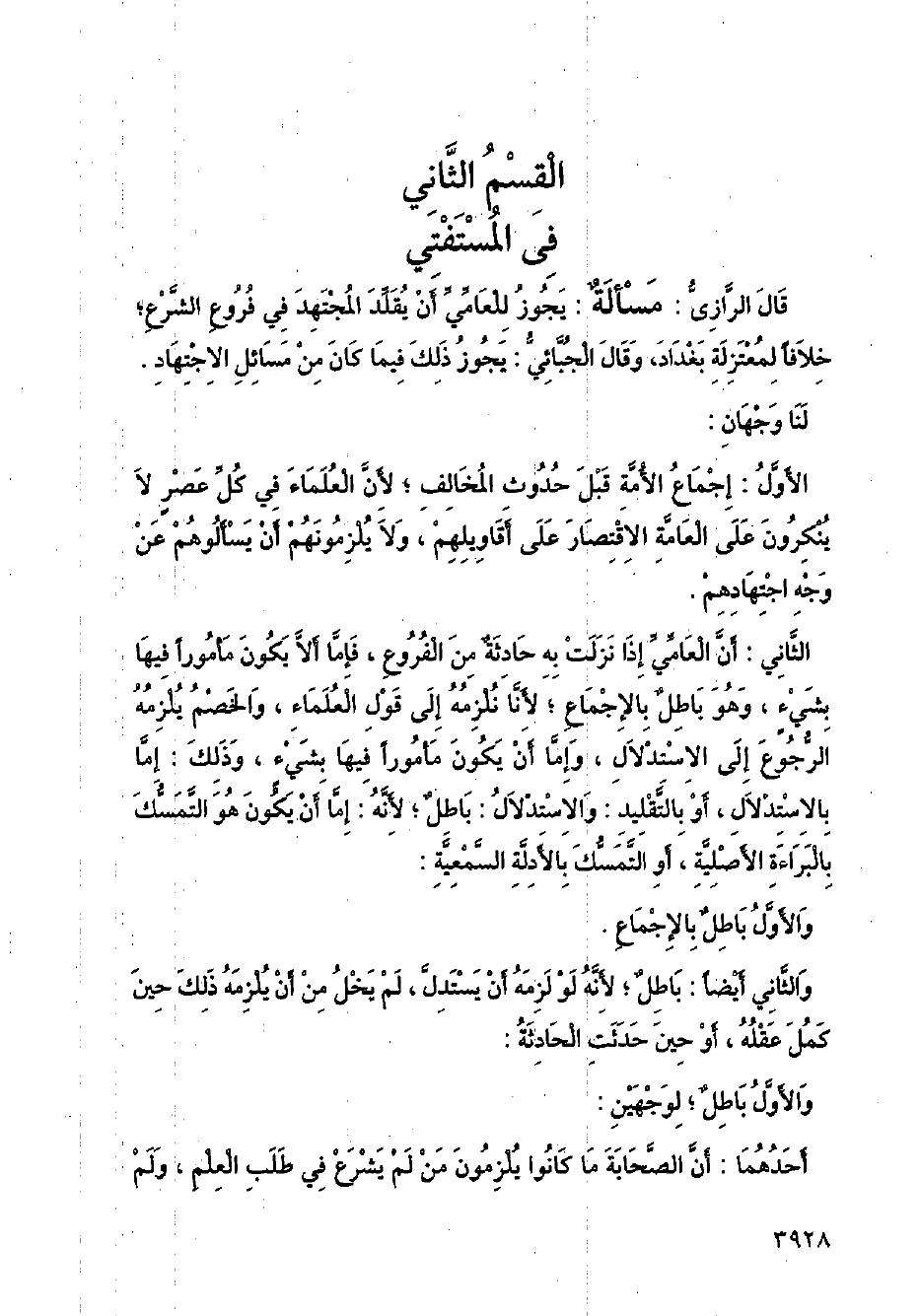 الثاني: أن العامي إذا نزلت به حادثه من الفروع، فإما ألا يكون مأمورًا فيها بشيءٍ، وهو باطل بالإجماع؛ لأنا نلزمه إلى قول العلماء، والخصم يلزمه الرجوع إلى الاستدلال، وإما أن يكون مأمورًا فيها بشئ، وذلك: إما بالاستدلال، أو بالتقليد: والاستدلال: باطل؛ لأنه: إما أن يكون هو التمسك بالبراءة الأصلية، أو التمسك بالأدلة السمعية: