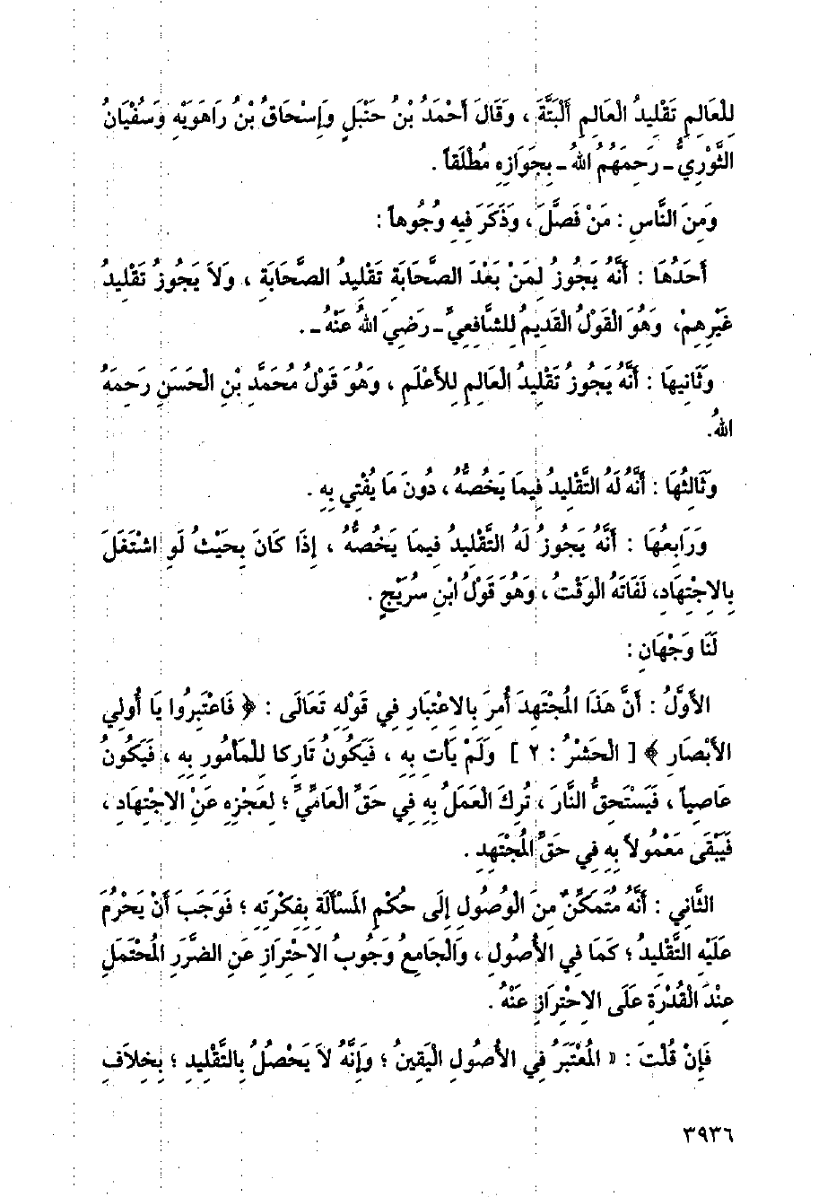 للعالم تقليد العالم ألبتة، وقال أحمد بن حنبلٍ وإسحاق بن راهويه وسفيان الثوري - رحمهم الله - بجوازه مطلقًا.