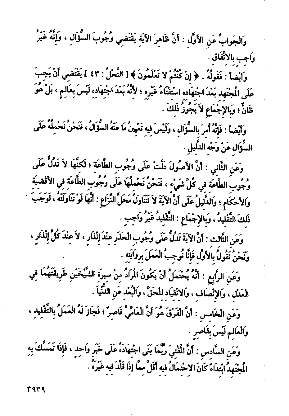 وعن الثاني: أن الأصول دلت على وجوب الطاعة؛ لكنها لا تدل على وجوب الطاعة في كل شيءٍ، فنحن نحملها على وجوب الطاعة في الأقضية والأحكام؛ والدليل على أن الآية لا تتناول محل النزاع: أنها لو تناولته، لوجب ذلك التقليد، وبالإجماع: التقليد غير واجبٍ.