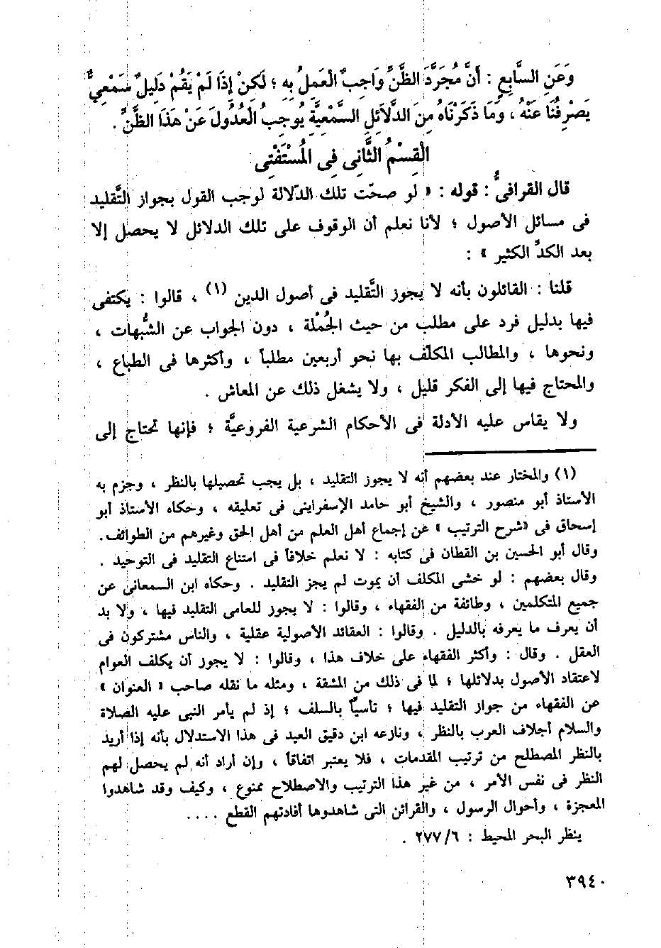 قال: القرافى: قوله: (لو صحت تلك الدلالة لوجب القول بجواز التقليد في مسائل الأصول؛ لأنا نعلم أن الوقوف على تلك الدلائل لا يحصل إلا بعد الكد الكثير):