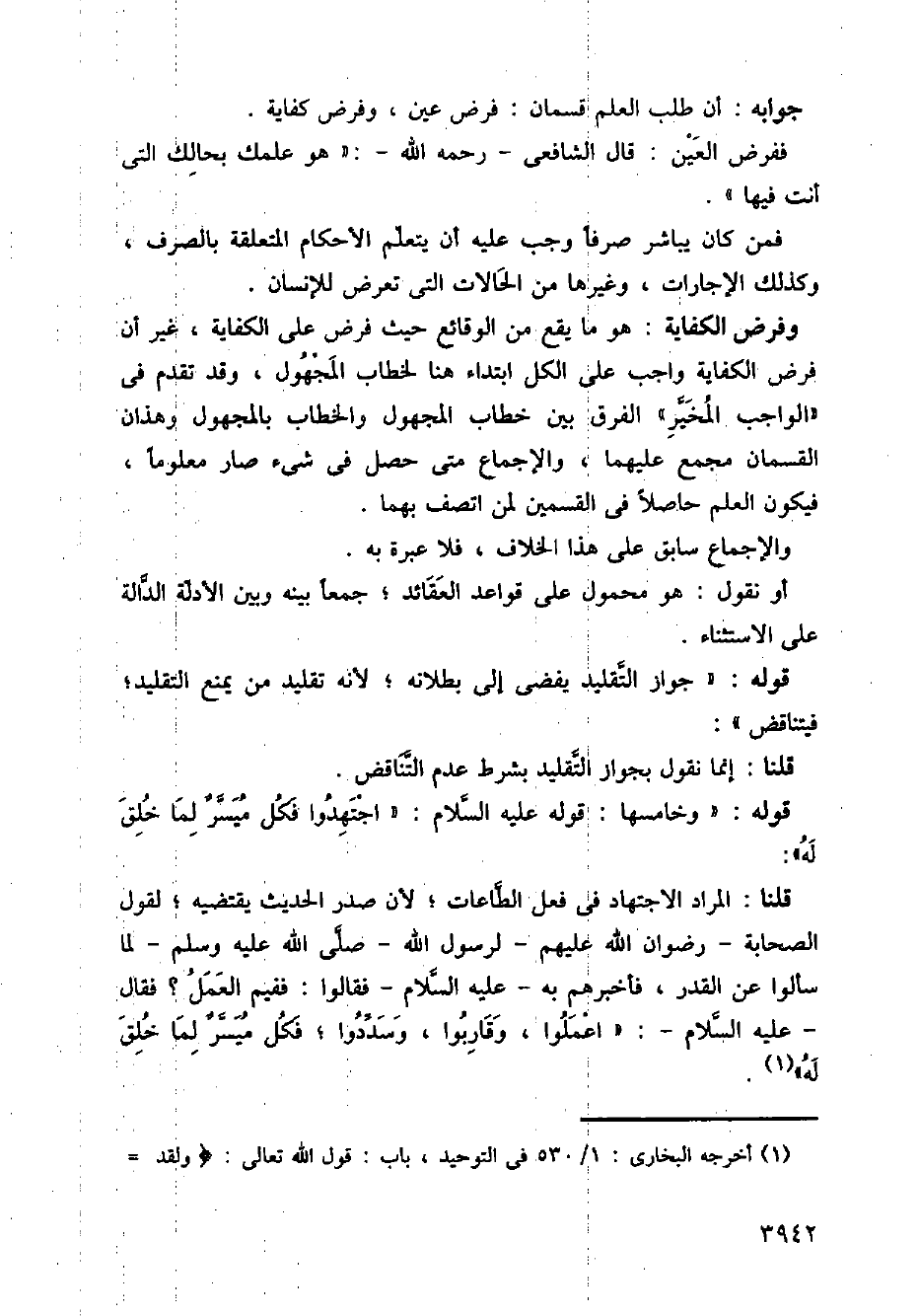 قلنا: المراد الاجتهاد في فعل الطاعات؛ لأن صدر الحديث يقتضيه؛ لقول الصحابة -رضوان الله عليهم -لرسول الله -صلى الله عليه وسلم -لما سألوا عن القدر، فأخبرهم به - عليه السلام -فقالوا: ففيم العمل؟ فقال -عليه السلام -: (اعملوا، وقاربوا، وسددوا؛ فكل ميسر لما خلق له).